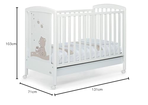 Legno di Faggio, Made in Italy, Rete a Doghe di Faggio, Ampio Cassetto, Regolabile a Doppia Altezza, 4 ruote, 131x71x103 cm, Bianco