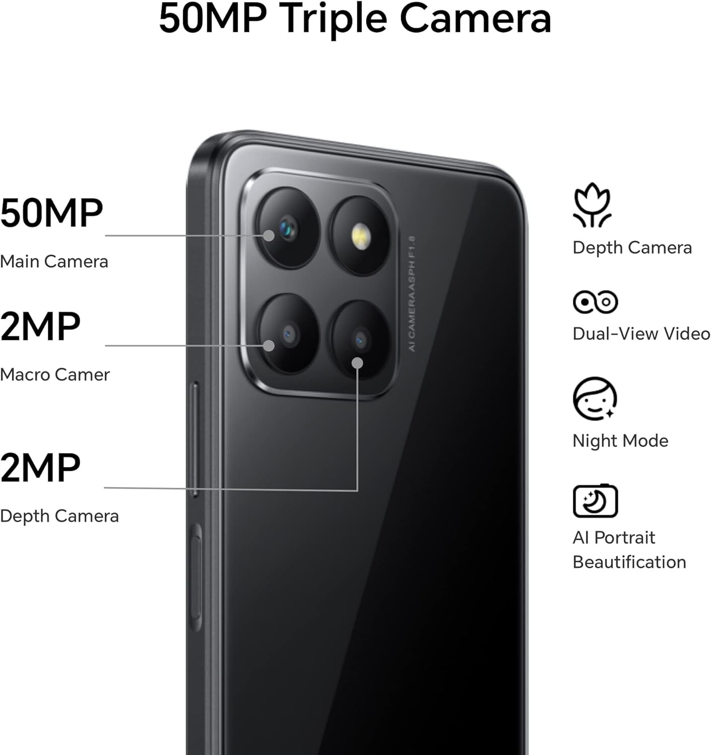 ✔️ Tripla Cam: principale 50MP + 2MP macro + 2 MP profondità, Cam frontale 8MP