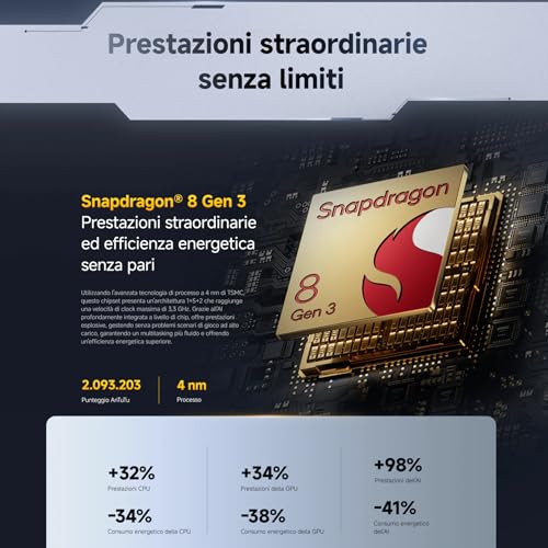 ✔️ SoC Qualcomm Snapdragon 8 Gen 3 a 4nm, RAM 12GB (LPDDR5X), Memoria 256/512GB (UFS 4.1)